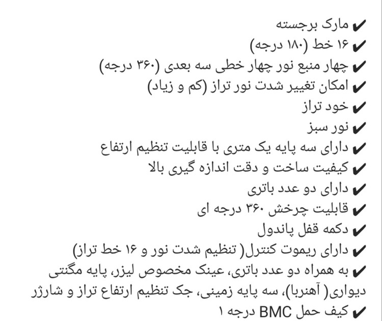 دارای دو عدد باتری ،عینک مخصوص لیزر ،پایه مگنتی دیواری